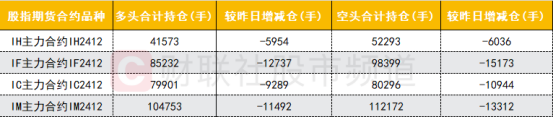 四大期指主力合约多空双方均大幅减仓,且空头减仓数量均大于多头,其中IF合约空头减仓数量明显大于多头。