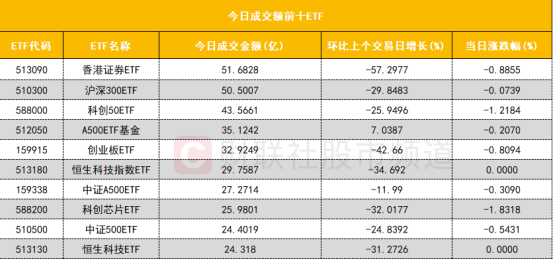 从成交额前十的ETF来看,香港证券ETF(513090)成交额位居首位;沪深300ETF(510300)成交额位居第二位。