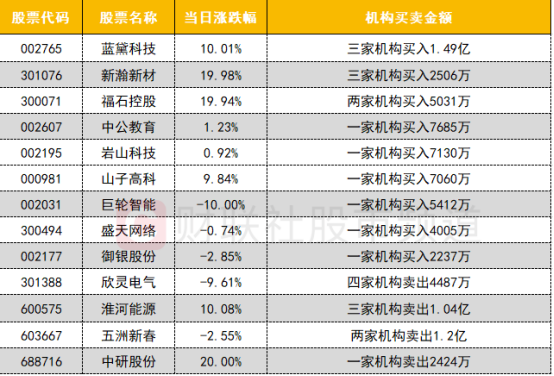 今日龙虎榜机构活跃度有所提升,减速器概念股蓝黛科技获机构买入1.49亿;AI应用股福石控股获机构买入超5000万,岩山科技获机构买入超7000万;跌停的机器人概念股巨轮智能获机构买入超5000万。