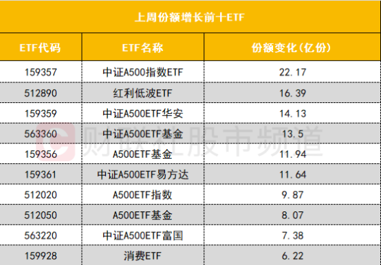 从上周份额增长前十的ETF来看,多只中证A500ETF位居前十行列,其中中证A500指数ETF(159357)上周份额增长22.17亿份位居首位。