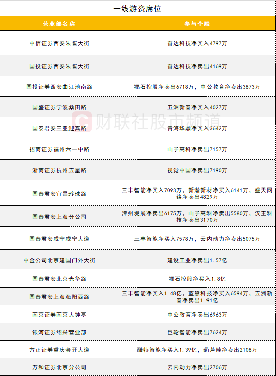 一线游资活跃度有所提升,机器人概念股三丰智能获三家一线游资席位合计买入近3亿;3连板的福石控股获国泰君安北京光华路营业部买入1.8亿;视觉中国遭两家一线游资席位合计卖出超2亿;建设工业遭中金公司北京建国门外大街营业部卖出1.57亿,同时获东方证券上海银城中路买入1.36亿。