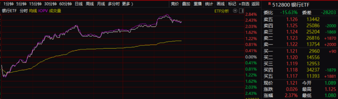 银行ETF一度大涨近3%。