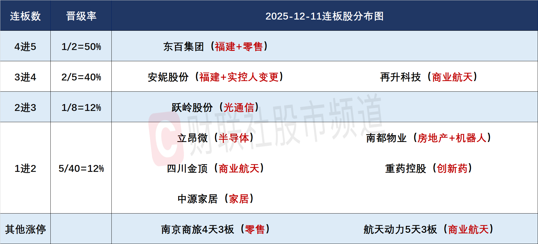 板块方面,商业航天成硕果仅存的热门板块,其中再升科技4连板,航天动力5天3板,四川金顶6天3板,通光线缆、中钢洛耐20CM涨停,消息面上,马斯克北京时间12月11日在X上确认了“SpaceX计划明年通过IPO筹集数百亿美元资金”的消息。