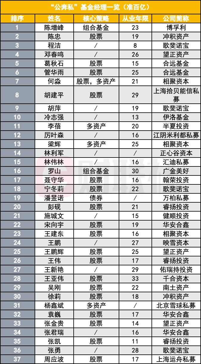 再看准百亿私募,“公奔私”基金经理共有37位,其中股票策略基金经理18位,从业至少20年的有16位;从机构看,歌斐诺宝有4位,望正资产、相聚资本、睿扬投资、华安合鑫各有3位。