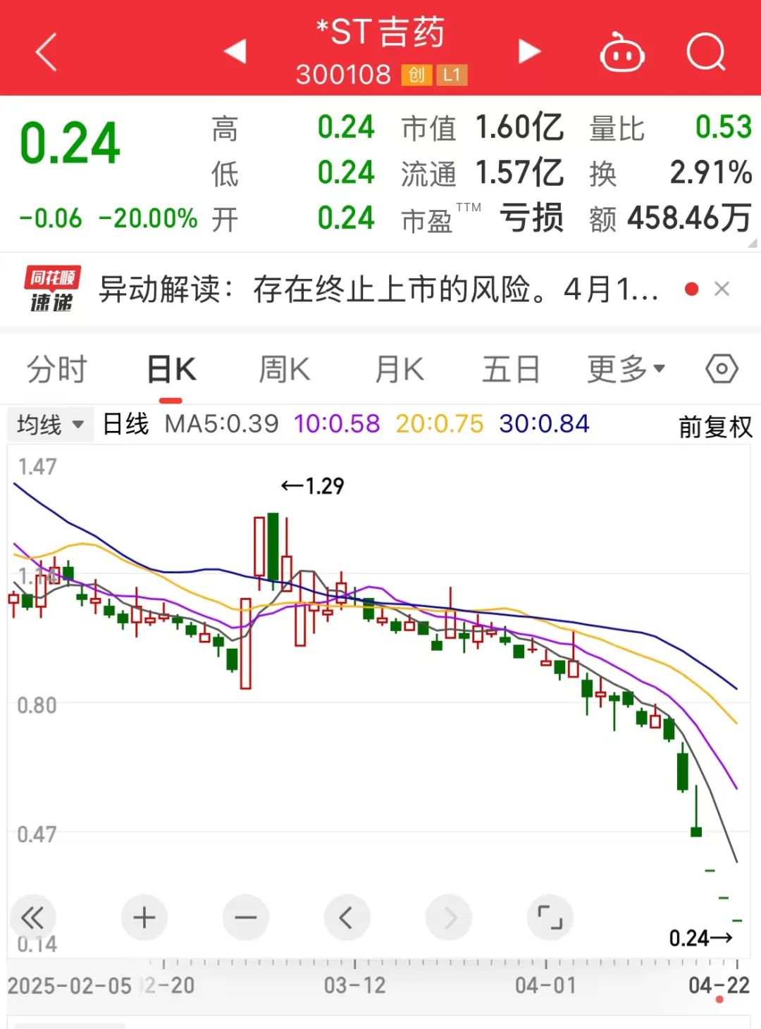 4月22日早盘,*ST吉药开盘一字跌停,盘中跌停板封单超100万手。此前2个交易日,该股均遭遇“20cm”跌停板。目前公司股价仅0.24元/股,A股市值仅1.6亿元,股价和市值均排在A股倒数第一。