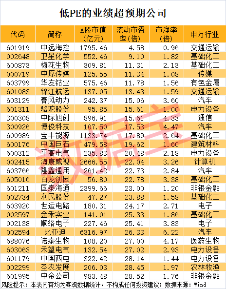 估值水平方面,截至4月21日收盘,27家公司滚动市盈率低于30倍,其中6家公司市盈率不到15倍,分别为中远海控、卫星化学、梅花生物、中原传媒、华友钴业、锦江航运。此外,23家公司市净率低于3倍,中远海控、骆驼股份、中原传媒、国泰海通、中国西电等市净率不到1.5倍。