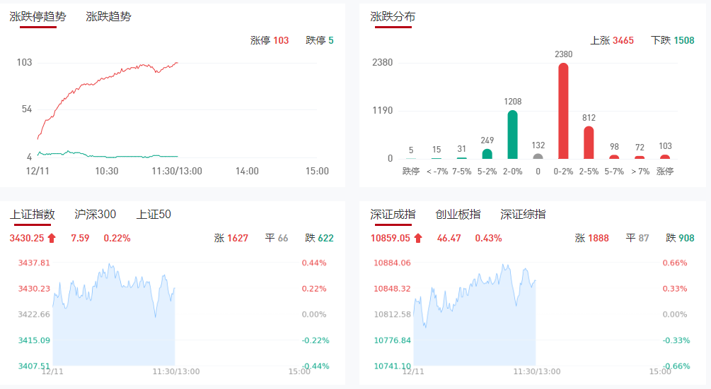指数早盘震荡反弹,三大指数均小幅上涨,大消费股再度走强,零售、食品饮料等方向领涨。沪深两市半日成交额1.13万亿,较上个交易日缩量3752亿。盘面上市场热点较为杂乱轮动较快,题材板块相对活跃,全市场超3500只个股上涨,逾百股涨停或涨超10%。从板块来看,抖音豆包及消费电子概念股集体走强,省广集团等多股涨停。此外,受利好消息刺激,上海国企改革概念股表现活跃,市北高新等10余股涨停。