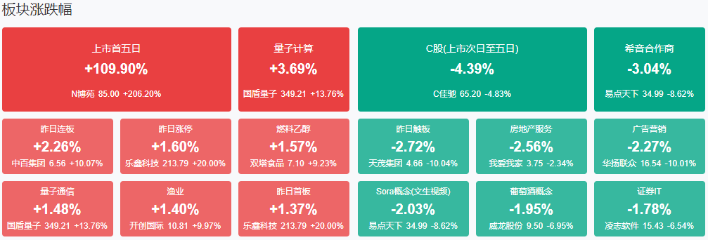 板块方面,上海国企改革、AI眼镜、零售、量子科技等板块涨幅居前,保险、Sora概念、银行、电商等板块跌幅居前。截至收盘,沪指涨0.22%,深成指涨0.43%,创业板指涨0.08%。