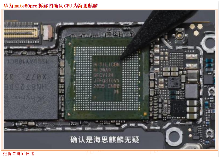 同时,在RAM的下方,就是华为Mate60 Pro的核心SoC。通过丝印可以确定,这款处理器来自海思麒麟,并非高通骁龙平台,同时从拆机图中的代码CN来看,这款处理器应该是纯国产。而根据目前网传的信息,这颗麒麟处理器的名称为麒麟9000S。目前网传这颗芯片制程为7nm,中芯国际代工,因为某些原因,我们对此不发表评论。