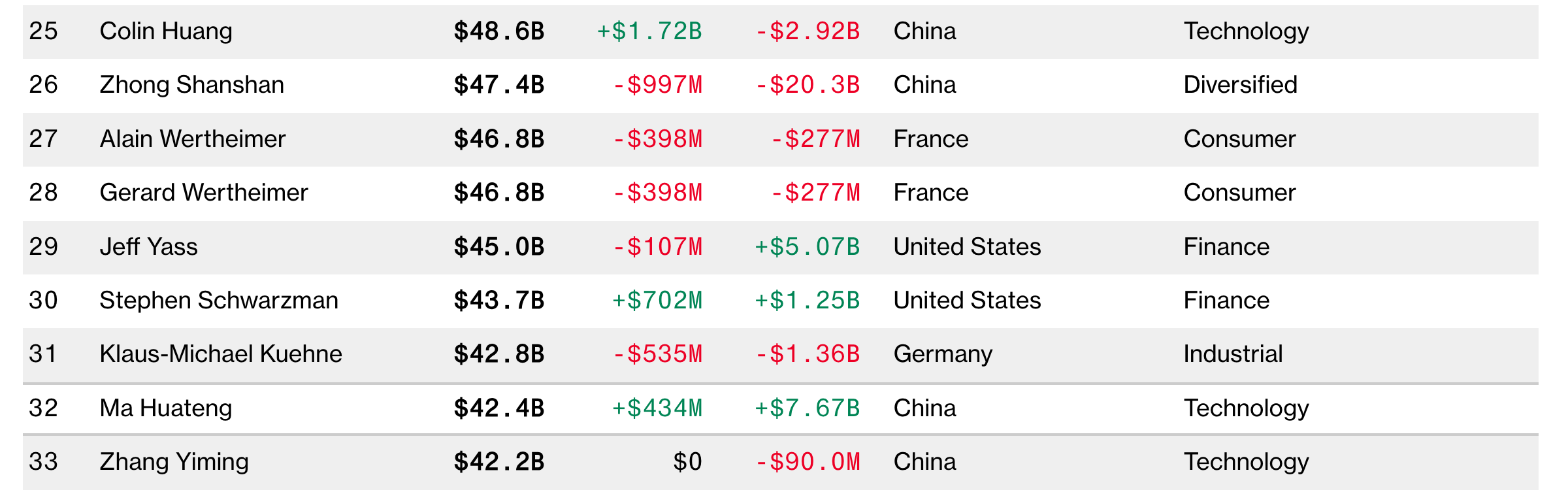 具体来看,彭博亿万富翁指数榜上,黄峥位列全球第25名,资产约是世界首富马斯克的五分之一。钟睒睒以474亿美元的身价位列全球第26名。