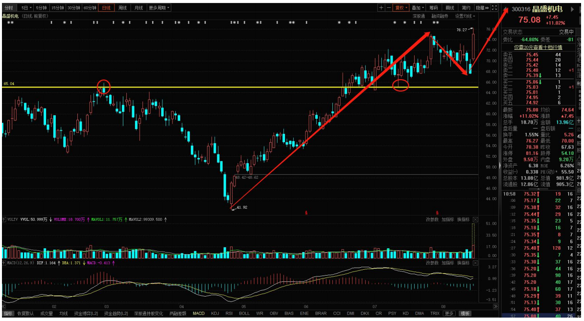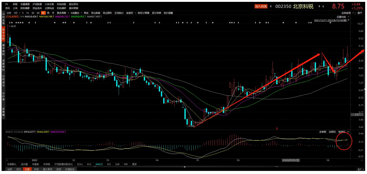 5、技术面上,K线正形成第二主升浪,下方有前期的高点支撑位,MACD正要高位金叉。
