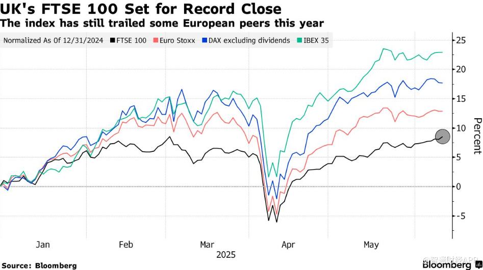 由于经济前景改善和贸易紧张局势缓解,英国富时100指数有望自3月份以来首次收于历史新高,收复了关税引发的暴跌。周二,该出口导向型指数一度上涨0.4%,至8871.41点,超过了3月份8871.31点的峰值。