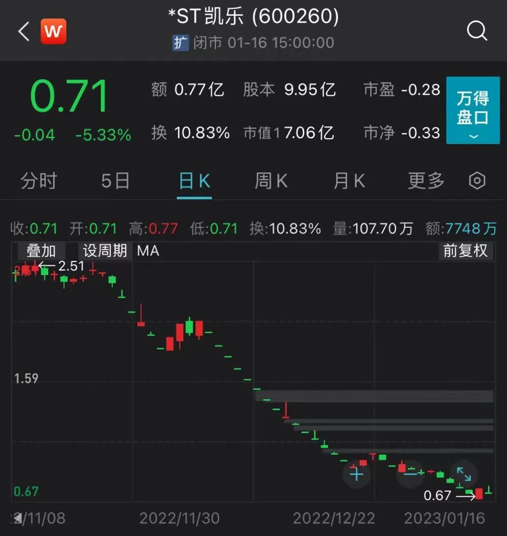 业绩预告公布后,*ST凯乐1月16日股价跌停,若1月17日收盘价低于0.71元,将提前锁定面值退市。
