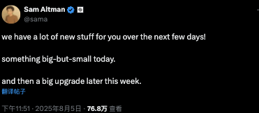 OpenAI首席执行官山姆·奥尔特曼周二宣布,公司将在未来几天里带来许多新东西,其中周二会迎来一项“小而重磅”的更新——预热已久的开源模型GPT-OSS。