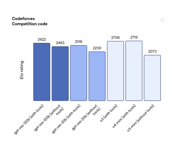 例如在Codeforces(带工具)的编程测试中,gpt-oss-120b和gpt-oss-20b的“跑分”分别为2622和2516分,虽然高于一些头部开源模型,但依然比不过头部闭源推理模型。