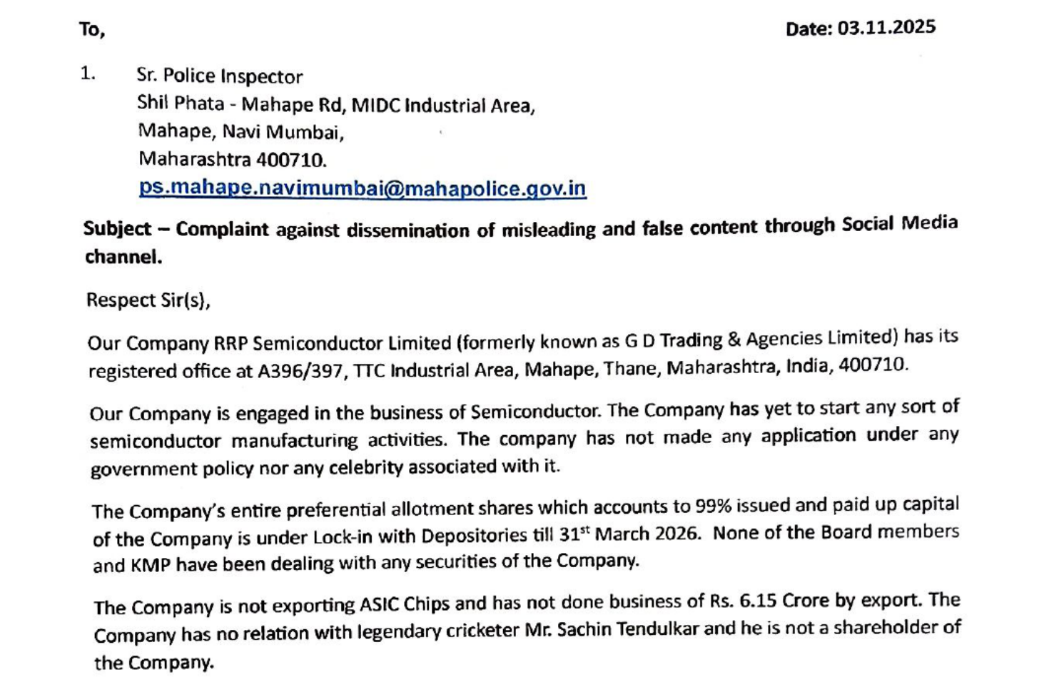 在11月3日的一份声明中,RRP半导体公司表示,尚未开展任何形式的半导体制造活动,也没有申请任何政府项目,并否认与任何名人有联系。公司同时表示,“拿到ASIC芯片出口大单”,板球明星持股、荣获行业奖项等社交媒体传言均为不实消息。