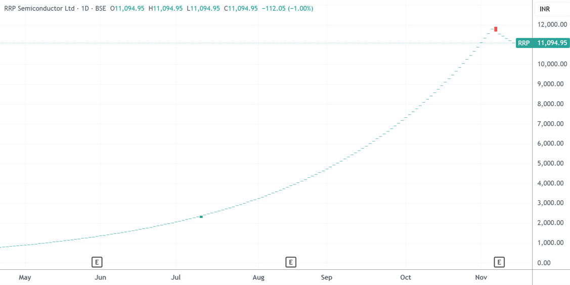 这也绘就了极其罕见的K线图:一眼望去全是涨停板。据统计,在印度监管不断升级交易限制(包括将涨停限制在2%)的背景下,RRP半导体硬是连续打出149个涨停板。作为最新应对措施,这只股票自11月开始每周只允许交易一天。
