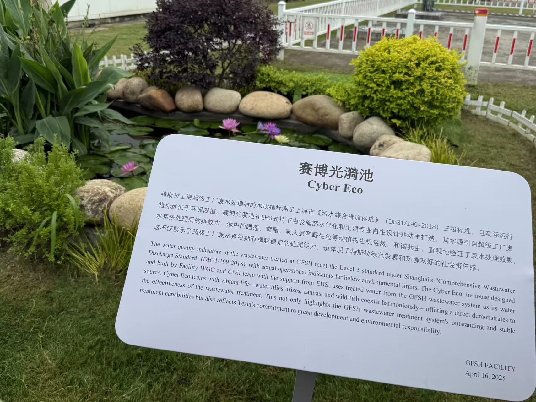 时值2025年上海市节能宣传周,记者在特斯拉上海超级工厂中,发现不少“绿色”身影。其中,一处名为“赛博光漪池”的地方引人注目,池中睡莲与美人蕉绽放。