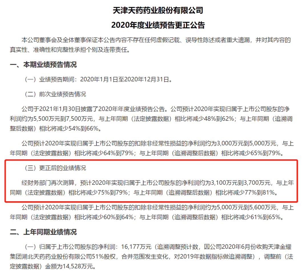 领了这一罚单,天药股份随即下修2020年的业绩预告,从原来的净利润“5500万元-7500万元”调整为“3100万元-3700万元”。