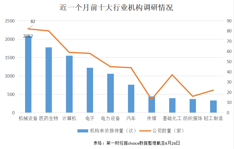 Choice数据显示,截至6月26日,近一个月有676家上市公司接待了来自机构投资者的调研,合计来访接待量超过1.3万次。记者根据公开资料梳理后发现,按申万行业一级分类,机构调研主要集中在机械设备、医药生物、计算机、电子和电力设备等五大行业,相关个股数量近乎占据了总量的“半壁江山”(48%)。