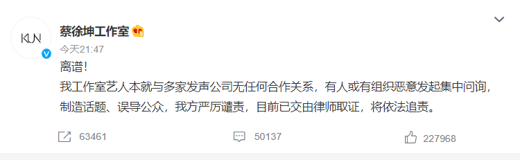 对此,蔡徐坤工作室8月9日晚间回应称离谱。蔡徐坤工作室称,我工作室艺人本就与多家发声公司无任何合作关系,有人或有组织恶意发起集中问询,制造话题、误导公众,我方严厉谴责,目前已交由律师取证,将依法追责。