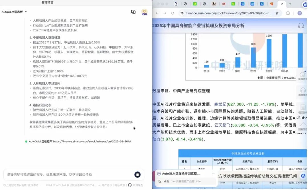 比如在具身智能行业研究任务中,向AutoGLM沉思智能体发布“请挖掘当前A股市场中与具身智能相关的热点主题。搜集最近三个月内的实时行业新闻、公开数据、权威报道和专家评论,结合关键财务和经营指标进行量化分析,形成一份主题投资深度研报,包括趋势预测、竞争格局、投资策略和风险分析”的指令后,AutoGLM沉思智能体将一边搜索,一边像人类一样用Chrome浏览器打开并浏览网页,不仅包括多家财经网站的公开报道,还有券商研报、知乎文章等,全程行云流水地完成数据检索、分析、生成报告等任务。