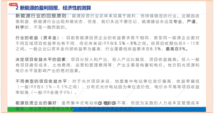 行业的收益(资本金):目前各能源投资企业的收益要求各不相同,甚至同一能源企业面对不同区域项目收益率也有不同,但总体来说IRR在6.5%-8%之间。投资回收期也在8-15年之间。一般企业以资本金内部收益率为基准,行业里最低收益要求在6.5%,最高在8%。