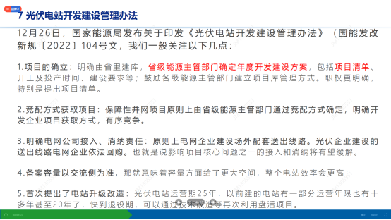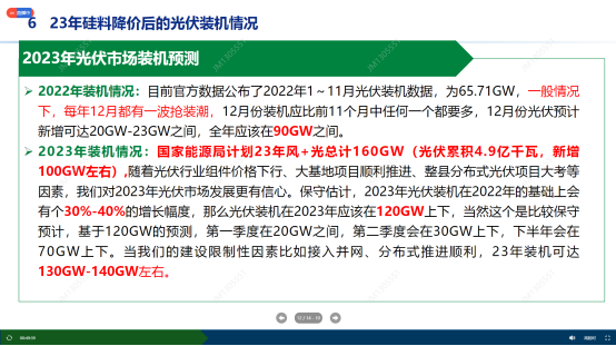 组件价格的波动影响:2023年组件价格将在1.6-1.85元/W之间波动,对市场刺激主要有两方面:一是能够给更多的项目通过立项,也就是说项目成立,二是对在建项目一定刺激作用,在执行层面建设过程中原则是不受组件价格波动的影响,但在决策层面为提高项目收益进而改善整个公司资产收益,往往会对执行层进行施压,促使其加快建设节泰。
