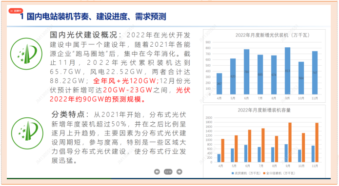 根据1-11月已并网的风光装机量,可以预计2022年的新增风电装机量在35GW以内,2022年新增光伏装机量在85GW以上;光伏产业链方面,降价周期需求旺盛已成共识,重点关注后续产业链利润再分配以及电池新技术进展,短期应重点关注降价节奏以及下游排产拐点。