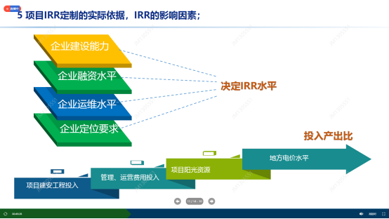 第五利率因素,利率因素是影响项目收益的重要因素,一般国有发电企业融资成本都很低最低会到3.1-3.3%左右,但在前期决策阶段往往不会用这么低的利率。储能一般按1500元/kWh考虑,容量根据不同区域有不同要求,但储能往往使项目总体收益下降,收益率另行计算。