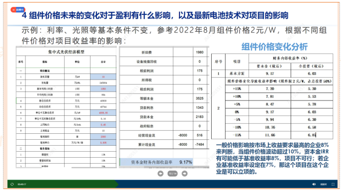 一般价格影响按市场上收益要求最高的企业8%来判断,当组件价格波动超过10%,资本金IRR有可能低于基准收益率8%,项目不可行;若企业基准收益率设定在7%,那这个项目在这个企业是可以立项的。