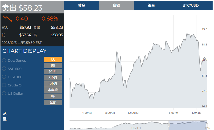 周三,白银价格继续上涨,升至纪录高位,因交易员押注供应持续紧张以及美联储将降息。白银价格一度最高上涨 0.8%,达到每盎司 58.9471 美元,超过了两天前创下的 58.84 美元的前期高点。但随后有所回落,截至发稿,回落至58美元附近。