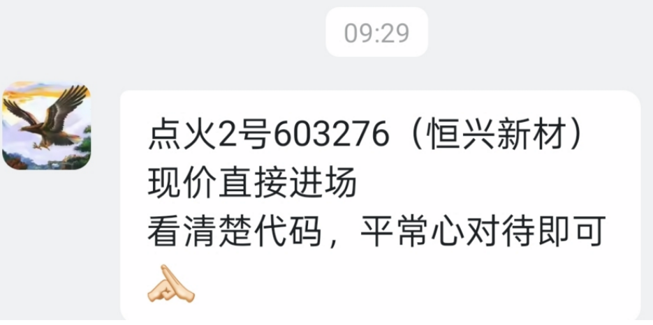 还有网友贴出疑似荐股的截图,在早上9点29分,有人在群里发布“点火2号603276(恒兴新材)现价直接进场看清楚代码,平常心对待即可”的消息。