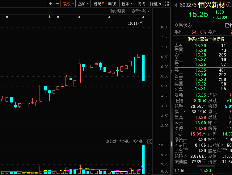 4月1日,恒兴新材小幅低开,开盘后2分钟,该股成交量急速放大,股价迅速拉升至涨停板,但很快又大幅下跌至绿盘。截至收盘,该股下跌8.3%,全天成交额5.09亿元,是昨天成交的7倍多,创近一年来新高,全天振幅达到19.42%,创上市以来单日新高(不含上市首日)。