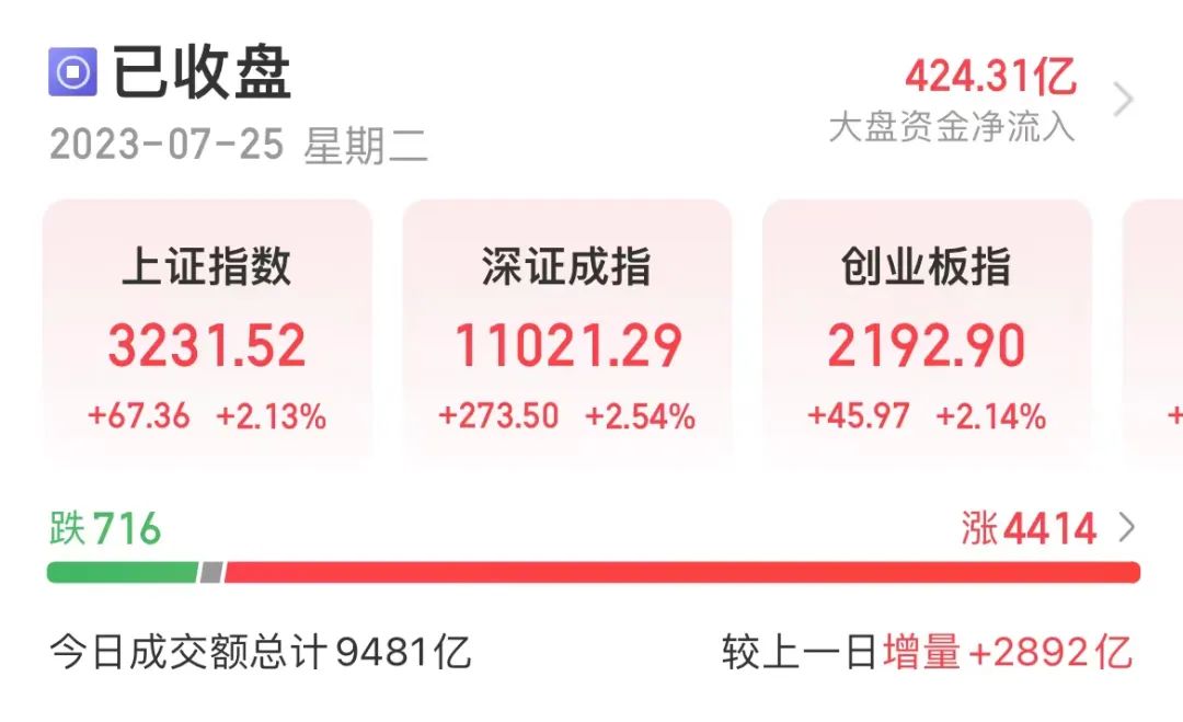 重大利好之下今天A股市场全线飙升,上证指数大涨超2%,重回3200点大关,创业板指涨幅也接近2%。板块方面,大金融大消费集体大涨,房地产、非银金融两大行业均涨超5%;建筑材料、家用电器、食品饮料、汽车等板块均大涨超3%。