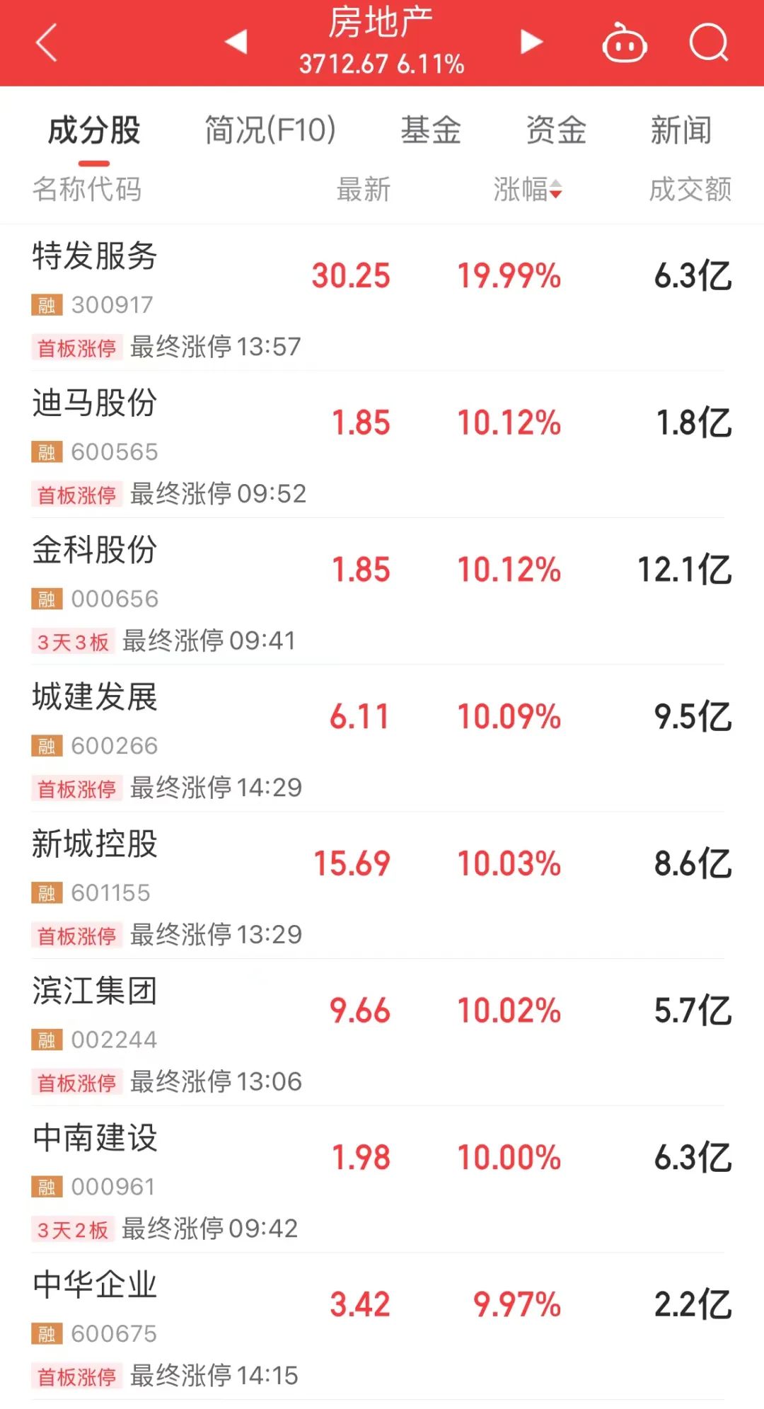 个股方面,收盘有4000多股上涨。地产股掀起涨停潮,特发服务、德必集团两股20cm涨停,迪马股份、金科股份、城建发展等10多股涨停。权重股方面,万科A、保利发展、招商蛇口等均涨超7%。跌幅最大的个股是东威科技,收盘跌超15%。