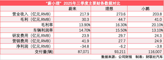 横评“蔚小理”2025三季报:蔚来、小鹏多项指标创新高 理想净亏后反思求变