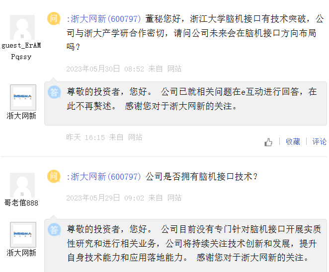 浙大网新直接被投资者问“烦”了。公司刚开始回复称目前没有专门针对脑机接口开展实质性研究和进行相关业务。又被多次问及后,公司直接回复已就相关问题进行回答,不再赘述。