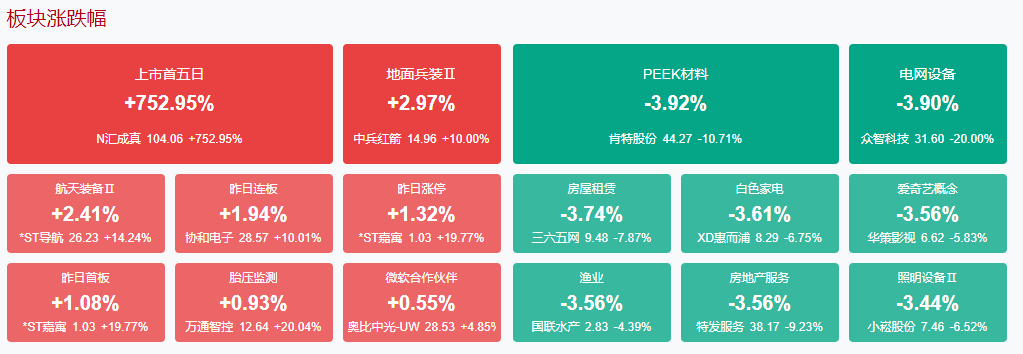 盘面上,车路云概念股持续活跃,万通智控、鸿泉物联、金溢科技、多伦科技涨停。军工股震荡走强,中兵红箭、北方导航涨停。半导体板块开盘拉升,中晶科技、协和电子涨停。下跌方面,地产股集体调整,特发服务跌超9%;电网概念股震荡走低,九洲集团等多股跌超5%。板块方面,车路云、军工等少数板块上涨,房地产、虚拟电厂、工业金属、家用电器等板块跌幅居前。