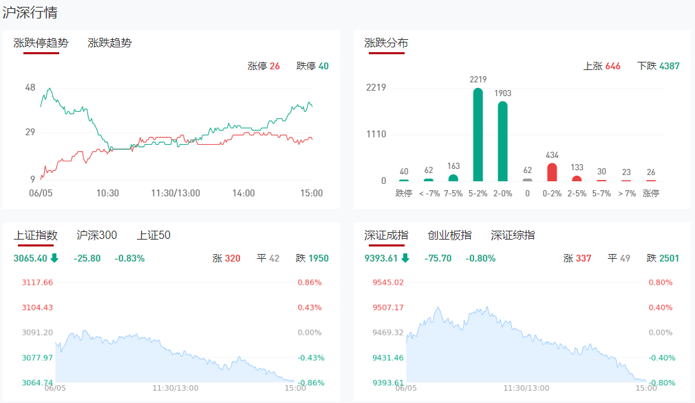 市场全天震荡走低,沪指领跌。截至收盘,沪指跌0.83%,深成指跌0.8%,创业板指跌0.54%。总体上个股跌多涨少,全市场超4600只个股下跌。沪深两市今日成交额6886亿,较上个交易日缩量571亿。