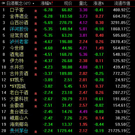 3月14日早盘,白酒股跌幅明显。截至发稿,口子窖、舍得酒业等5股跌超5%,泸州老窖大跌4.67%,贵州茅台跌2.24%。整个板块指数跌2.41%,位居行业跌幅榜首位。