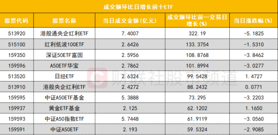 从成交额环比增长前十的ETF来看,多只红利和A50相关ETF位居前十行列,其中港股通央企红利ETF(513920)成交额环比增长322%位居首位。