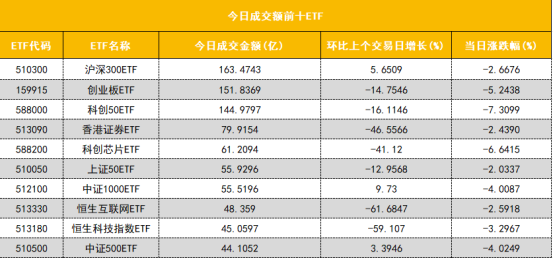 从成交额前十的ETF来看,沪深300ETF(510300)成交额位居首位,创业板ETF(159915)成交额位居第二位。