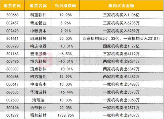 龙虎榜机构活跃度较高,但上榜个股多以净卖出为主。买入方面,跨境支付概念股科蓝软件获机构买入1.06亿;中粮资本获机构买入超6000万。