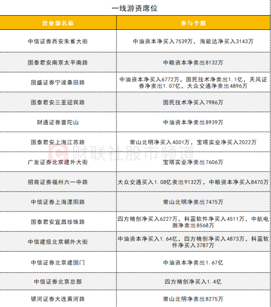 一线游资活跃度较高,今日部分高位股迎来修复,多股遭游资激烈博弈,其中中油资本获三家一线游资席位买入、两家一线游资席位卖出;中粮资本、常山北明、国民技术均有一线游资席位大幅买卖;跨境支付概念股四方精创获三家一线游资席位买入。