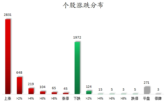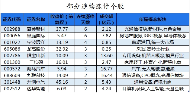 截至收盘,沪深两市合计2831个股上涨,1972只个股下跌,平盘个股271只,停牌的个股3只。不含当日上市新股,共有45只个股涨停,5只个股跌停。连续涨停天数看,皇庭国际、豪美新材均已连收6个涨停板,连续涨停板数量最多。