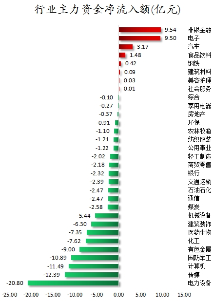 从行业板块来看,申万所属的31个一级行业,今日有8个行业板块主力资金呈现净流入,其中,非银金融行业板块主力资金净流入最多,净流入金额9.54亿元;行业板块主力资金净流入居前的还有电子、汽车、食品饮料,净流入金额分别为9.5亿元、3.17亿元、1.48亿元。23个行业板块主力资金呈现净流出,其中,电力设备行业板块主力资金净流出最多,净流出金额为20.8亿元;行业板块主力资金净流出靠前的还有传媒、计算机、国防军工、有色金属、化工,净流出金额分别为12.39亿元、11.49亿元、10.89亿元、9亿元、7.62亿元。
