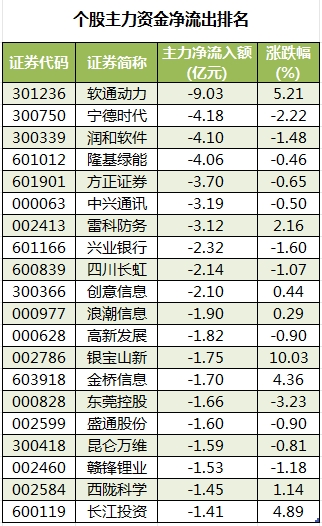 此外,3111只个股被主力资金净卖出,其中,34股被主力资金净卖出超1亿元。主力资金净流出最多的个股是软通动力,净流出金额为9.03亿元;主力资金净流出居前的个股还有宁德时代、润和软件、隆基绿能、方正证券、中兴通讯,净流出金额分别为4.18亿元、4.1亿元、4.06亿元、3.7亿元、3.19亿元。