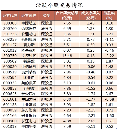 活跃个股方面,北向资金今日净买入较多的有中际旭创、迈瑞医疗、软通动力、药明康德、赛力斯,净买入金额分别为1.45亿元、1.33亿元、1.31亿元、0.72亿元、0.39亿元。北向资金净卖出较多的有中国平安、长江电力、兴业银行、东方财富、工业富联,净卖出金额分别为5.11亿元、2.65亿元、2.21亿元、2.15亿元、1.82亿元。