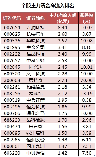 个股来看,今日有1957个股获主力资金净流入,其中,30股获主力资金净流入超1亿元。万润科技获主力资金净流入最多,净流入金额为8.44亿元;主力资金净流入居前的个股还有长安汽车、华映科技、中金公司、福晶科技、中科金财,流入金额分别为3.6亿元、3.57亿元、3.41亿元、3.4亿元、2.53亿元。